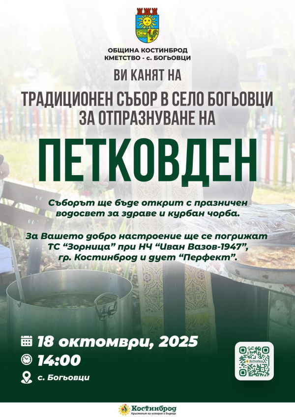 На 18 октомври 2025 г. от 14:00 ч. в село Богьовци ще се проведе традиционният събор по случай Петковден. Събитието е организирано от Община Костинброд и Кметство Богьовци и е посветено на един от почитаните есенни празници в християнския календар. Празничният ден ще започне с тържествен водосвет за здраве, след което всички гости ще могат да се насладят на курбан чорба, приготвена специално за повода.