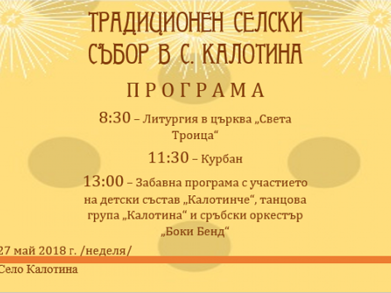 На 27 май, в село Калотина ще се проведе тържество по случай традиционния събор на селото.