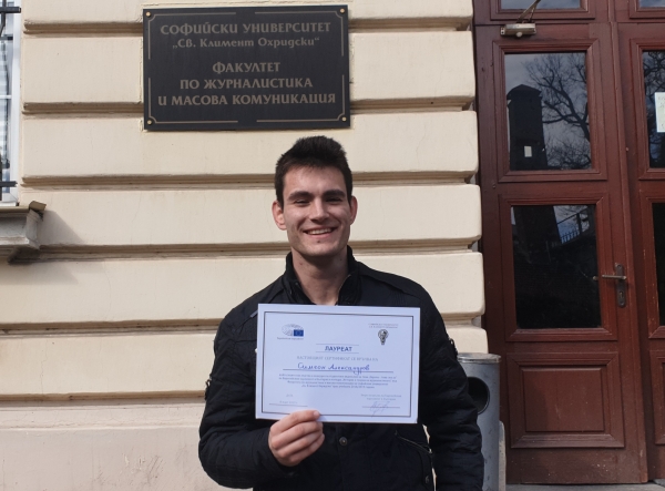 Победителят във второто издание на „Работилница за репортери“ Симеон Александров зае първо място в конкурс, организиран от Бюрото на Европейския парламент в България и катедра „История и теория на журналистиката“ във ФЖМК на СУ.