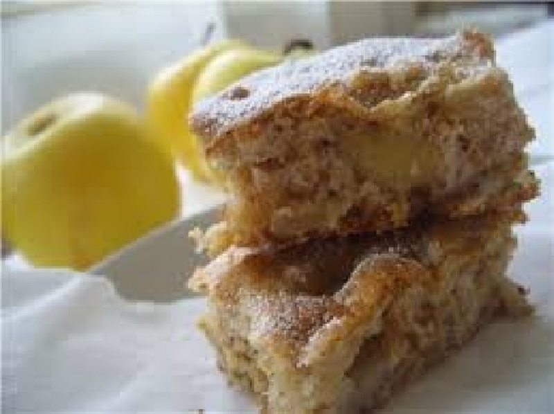 Сместа се изсипва в намазнена тавичка (26-28 см диаметър), отгоре безразборно се разпръскват парчетата ябълки, няколко начупени на едро ореха (по желание), поръсва се с канела, захар и се пече за около 40-50 минути. След като изстине сладкиша, се поръсва с пудра захар.