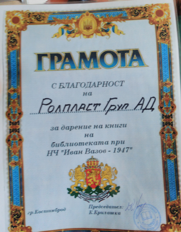 „Изказвам специална благодарност към служителите на Ролпласт, за направения жест. Дарените книги ще обогатят детския библиотечен фонд и ще позволят на много повече деца да имат досег да разнообразна и интересна литература. Няма съмнение, че четенето в детска възраст е изключително важно за развитието на подрастващите, а дарителството е една от формите, с които читалищните библиотеки могат да поддържат разнообразна и богата литературна колекция, с която да достигат до повече деца.“. Така, г-жа Татяна Кръстанова – библиотекар в библиотеката към НЧ „Иван Вазов 1947“ град Костинброд се обърна, за да приеме дарението от книги на служителите на лидера в производството на PVC, дървени и алуминиеви прозорци, врати и щори в България.