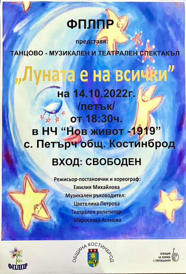 На 14 октомври /петък/, от 18.30 ч., в НЧ „Нов живот 1919“, село Петърч, ще бъде представен танцово-музикален спектакъл „Луната е на всички“, на фондация „Помощ на лица с проблеми в развитието“.