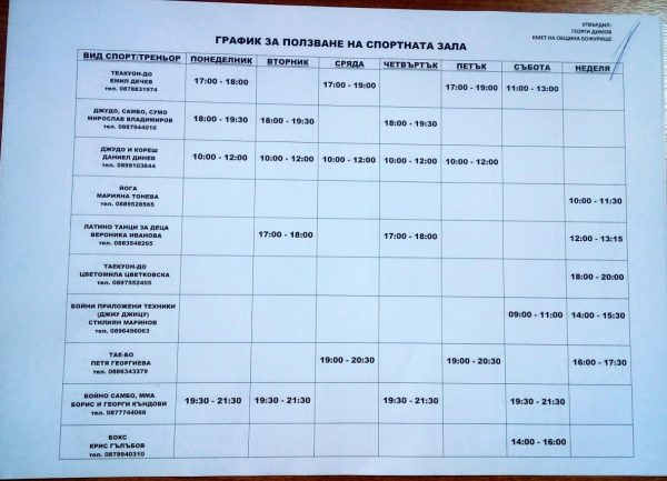 Спортната зала в града остава отворена за лица над 18 години и при спазването на всички противоепидемични мерки. Графикът за заниманията е както следва: