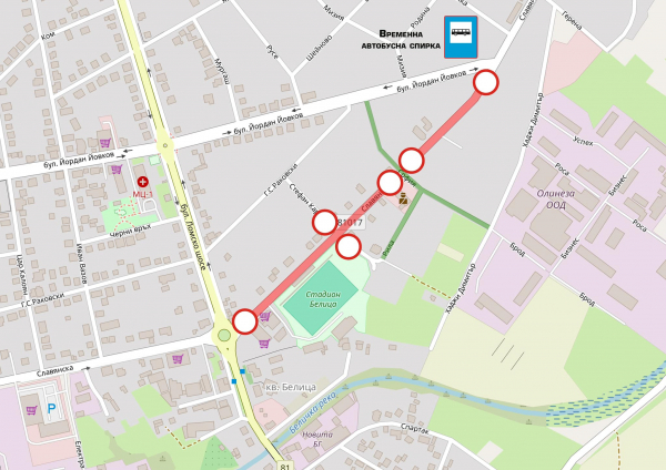Преминаването на МПС по ул. „София“ ще остане свободно. Горните обстоятелства ще наложат обслужването на автобусна спирка „Полиция“ да се осъществява от пресечката на ул. „Славянска“ с бул. „Йордан Йовков“ в гр. Костинброд. Община Костинброд своевременно ще уведомява за всяка организация на обекта, която би наложила съществени изменения по маршрута.