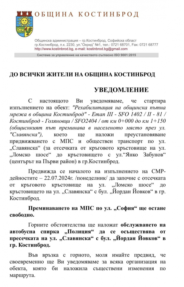 Стартира изпълнението на обект: „Рехабилитация на общинска пътна мрежа в община Костинброд“ – Етап III - SFO 1402 / II – 81 / Костинброд - Голяновци / SFO2404 / от км 0+000 до км 1+150 (общинският път преминава в населеното място през ул. „Славянска“), което ще наложи преустановяване придвижването с МПС и обществен транспорт по ул. „Славянска“ (за отсечката от кръговото кръстовище на ул. „Ломско шосе“ до кръстовището с ул. „Янко Забунов“ (центърът на Първи район) в гр. Костинброд.
