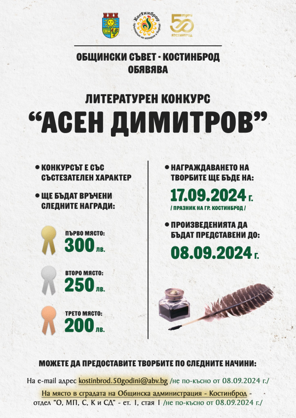 За седма поредна година, Общински съвет-Костинброд, обяви превърналия се в традиция за община Костинброд, литературен конкурс „Асен Димитров“, разпознаван досега като „Млад поет“. С всяка изминала година конкурсът се разширява и журито оценява все повече литературни произведения. До 2023 г. имаше ограничение във възрастта, за да бъдат стимулирани предимно младите поети на България, но през 2024 година, когато Костинброд навършва 50 години от обявяването си за град, Общинският съвет да разшири обхвата на конкурса. Наред с това, от 2024 г., конкурсът ще носи името на костинбродчанина Асен Димитров, и участие в него могат да вземат всички, пленени от силата и красотата на словото.