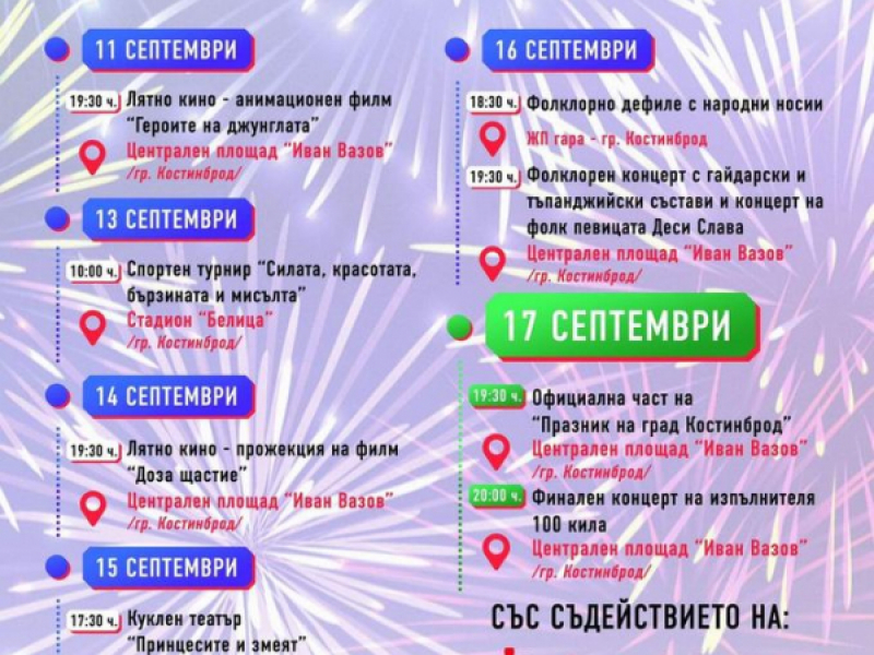 Куклен театър „Принцесата и змеят“ ще зарадва най-малките любители на театралното изкуство в Костинброд, на 15 септември, от 17:30 ч., на площад „Иван Вазов“. Празничната програма ще продължи в 19:30 ч., с концерт на група „Хоризонт“ и Христо Ламбрев от „Сигнал“ и лазерно шоу.