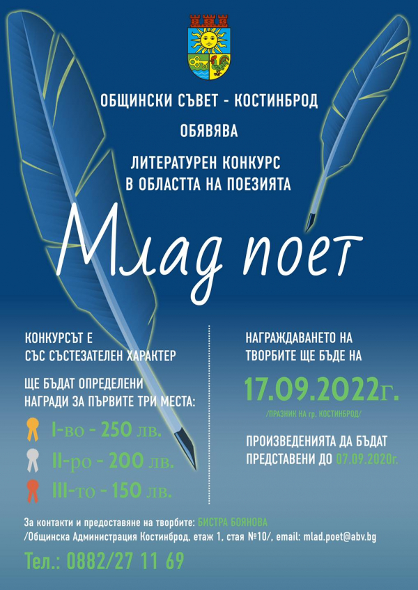 За поредна година Общински съвет – Костинброд дава поле за изява на млади поети и хора на изкуството. Стартира конкурсът „Млад поет“, в който талантите си ще премерят сили в областта на поезията.