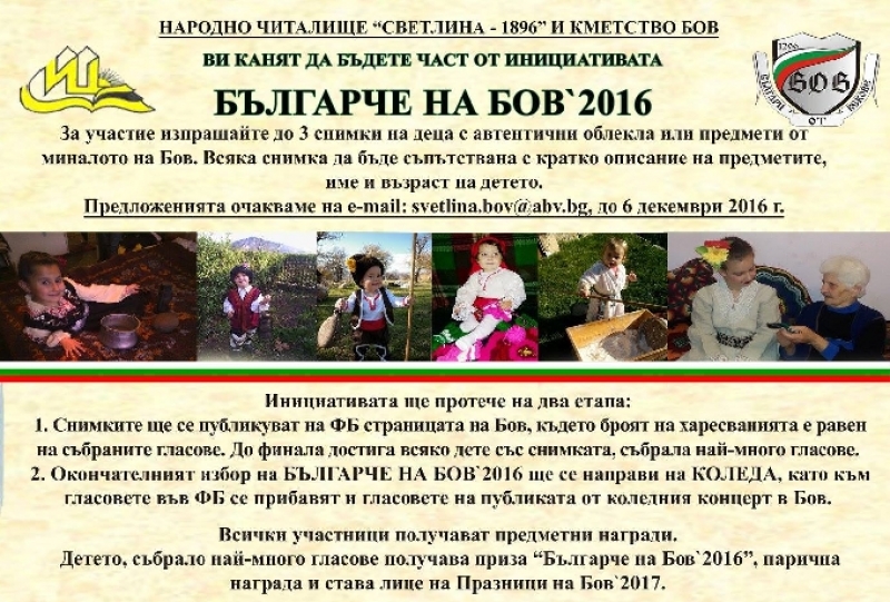 Народно читалище „Светлина – 1896“ и кметство Бов стартираха тазгодишното издание на инициативата „Българче на Бов“. Всеки, който желае да се включи в уникалния местен конкурс, чиято цел е да съхрани традициите и културата на Бов, може да го направи като изпрати три снимки на деца с автентични облекла или предмети от миналото на Бов. Снимките трябва да бъдат придружени с кратко описание на предмета и това, за което служи, както и с името и възрастта на детето, заснето на тях.