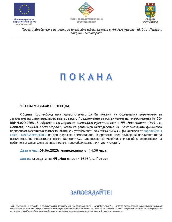 На 9 юни от 14:30 часа в сградата на НЧ „Нов живот 1919“, с. Петърч, ще се състои официална церемония за началото на строителството във връзка с проекта „Внедряване на мерки за енергийна ефективност в НЧ „Нов живот 1919“, с. Петърч, община Костинброд“.