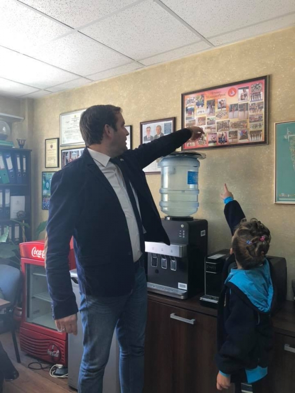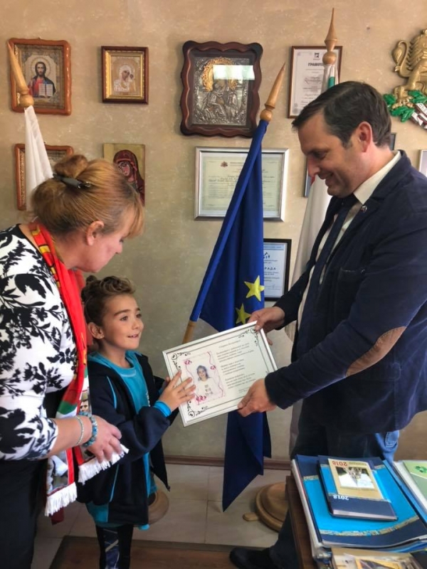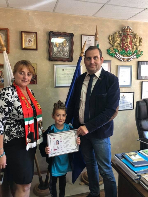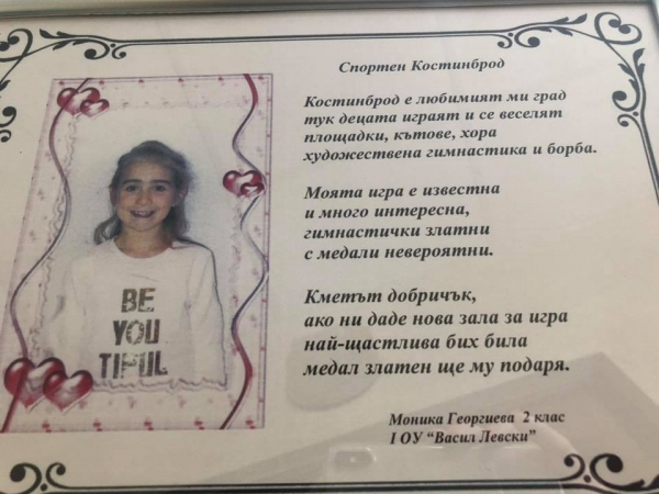 Второкласничката Моника Георгиева се срещна с кмета на община Костинброд - Трайко Младенов и му подари своето стихотворение „Спортен Костинброд“.