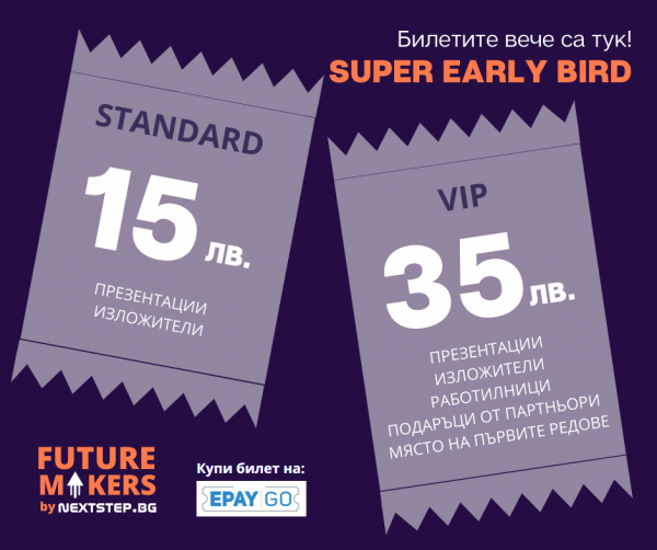 Билетите за Future Makers вече са в мрежата на EPAYGO, с възможност за ранна покупка при преференциални условия: https://epaygo.bg/5855594064. Участието в уъркшопите е част от разширения VIP пакет, който дава възможност за място на първите редове в основната зала и включва подаръци от организаторите NEXTSTEP.bg, както и от партньорите на събитието Sofia Ring Carting и Kabinata.com.