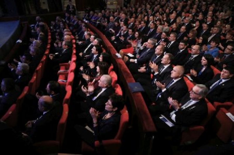 В залата на Народния театър присъстваха Негово Светейшество патриарх Неофит, вицепрезидентът и вицепремиерите на България, министри, народни представители, българският еврокомисар Мария Габриел и други.