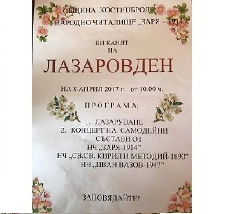 На Лазаровден – 8 април, празненствата в гр. Костинброд започват от 10:00 часа. Жителите и гостите на града ще могат да се потопят в атмосферата на лазаруването, а след това на концерт на самодейни състави от НЧ „Заря-1914“, НЧ „Св.Св. Кирил и Методий-1980“ и НЧ „Иван Вазов-1947“.