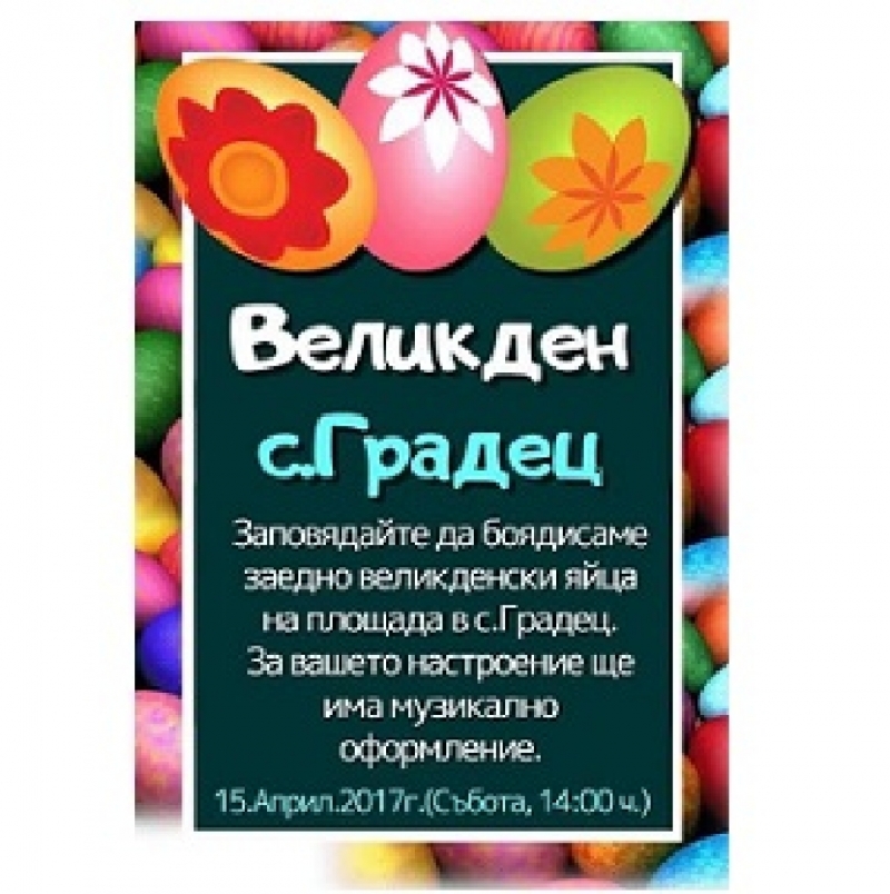 Великденските яйца в село Градец ще бъдат боядисани в събота – 15 април, от 14:00 часа на площада в селото. За да бъдат те изписани с настроение, организаторите са подготвили и музикална програма за участниците и гостите.