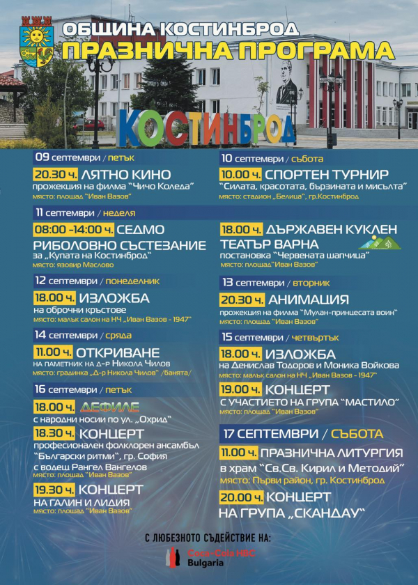 Лятно кино и театър за малки и големи, риболовен и спортен турнир, изложби, дефиле с народни носии и концерти с участието на фолклорен ансамбъл „Български ритми“, попфолк изпълнителите Галин и Лидия, група „Мастило“ и група „СкандаУ“, очакват жителите и гостите на Костинброд от 9 до 17 септември.