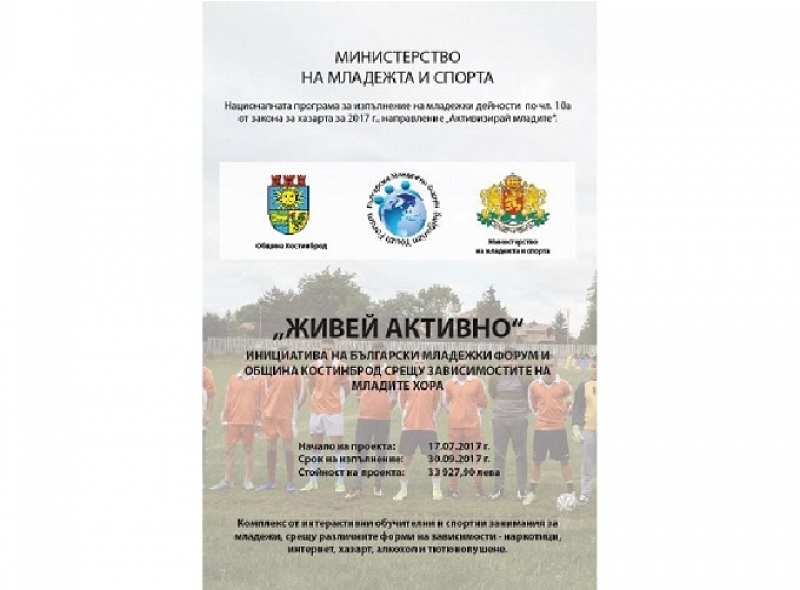 Проект „ЖИВЕЙ АКТИВНО“ е финансиран от Министерството на младежта и спорта и включва комплекс от интерактивни обучителни и спортни занимания за младежи срещу различните форми на зависимости – наркотици, интернет, хазарт, алкохол и тютюнопушене.
