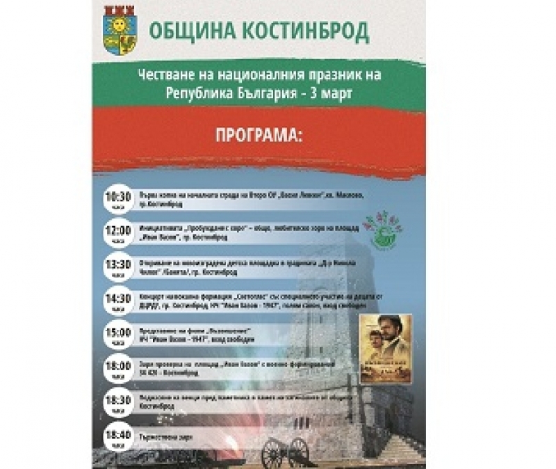 Богата програма е подготвила Община Костинброд за отбелязването на Националния празник Трети март. Мероприятията ще започнат в 10:30 часа с Първа копка на началната сграда на Второ ОУ „Васил Левски“ в кв. Маслово.