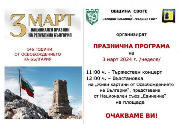 С празничен концерт и възстановка на „Живи картини от Освобождението на България“, в Своге ще отбележат Трети март. Организатори на проявата са Община Своге и НЧ „Градище 1907“.
