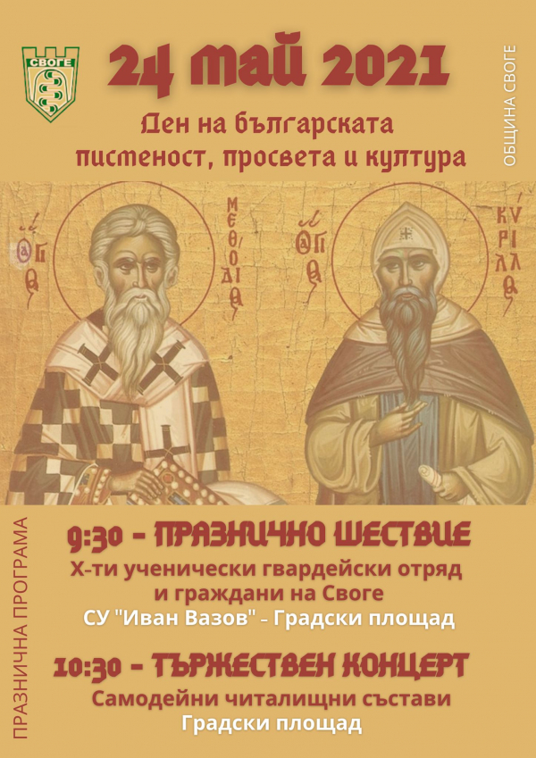 Община Своге кани всички, които желаят да отдадат уважение и почит към делото на светите братя Кирил и Методий, да споделят празника.