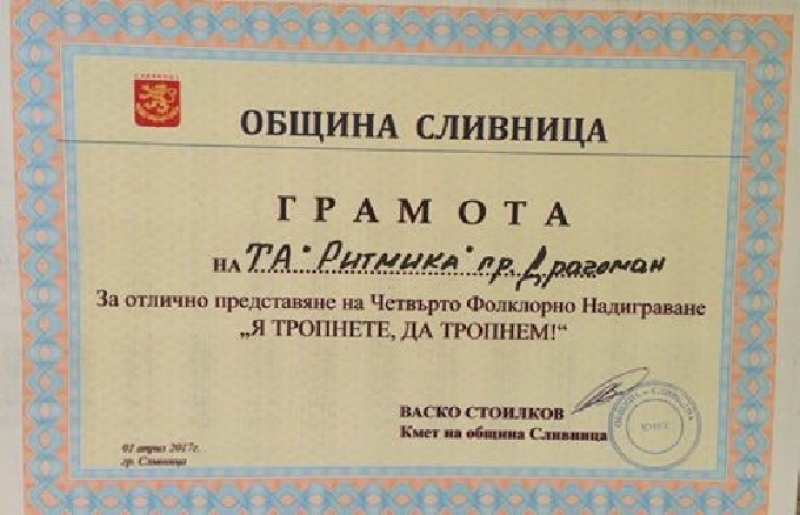 Танцов ансамбъл "Ритмика" - гр. Драгоман  взе участие във фолклорното надиграване "Я тропнете, да тропнем", което се проведе на 1 април в зала Арена Сливница - гр. Сливница.