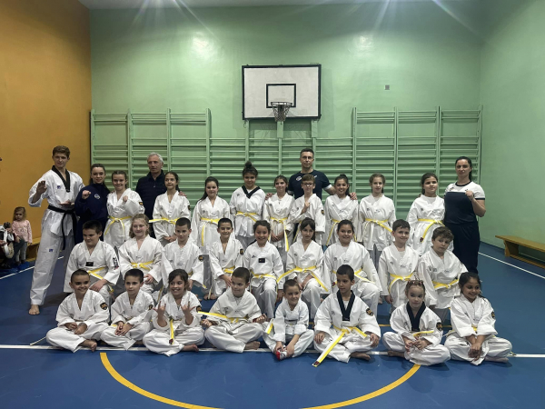 Децата, трениращи таекуондо получиха от своя треньор Ангел Кирчев Бял колан с жълта лента – степен 9 ГУП.