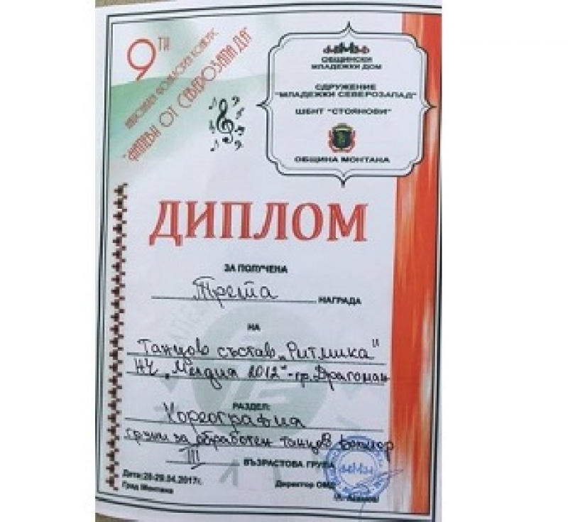 Танцьорите си тръгнаха с отличие и от Националното фолклорно надиграване „Напеви от Северозапада 2017"- гр. Монтана. Те спечелиха третото място в раздел Хореография, групи за обработен танцов фолклор - 3-та възрастова група до 18 години.