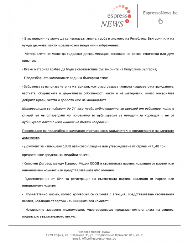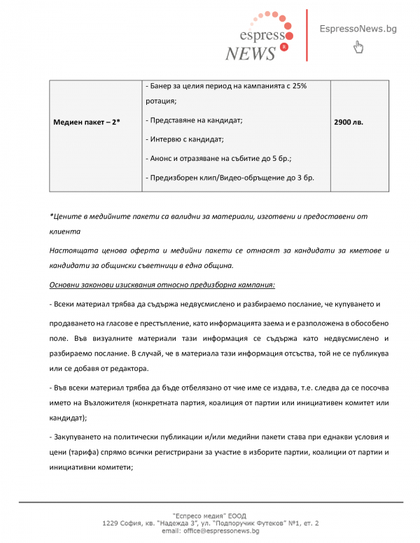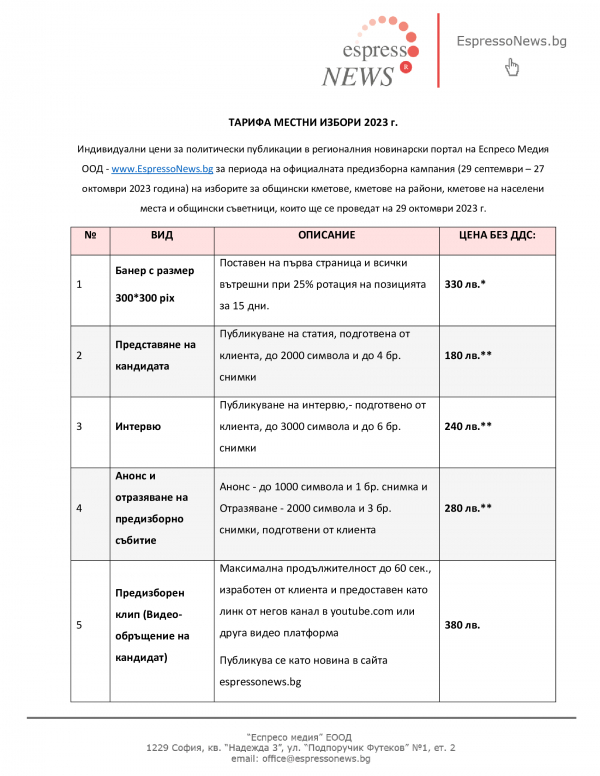 Рекламната тарифа за публикации в регионалния новинарски портал на Еспресо Медия  www.EspressoNews.bg за периода на официалната предизборна кампания (29 септември – 27 октомври 2023 година) на изборите за общински кметове, кметове на райони, кметове на населени места и общински съветници, които ще се проведат на 29 октомври 2023 г.