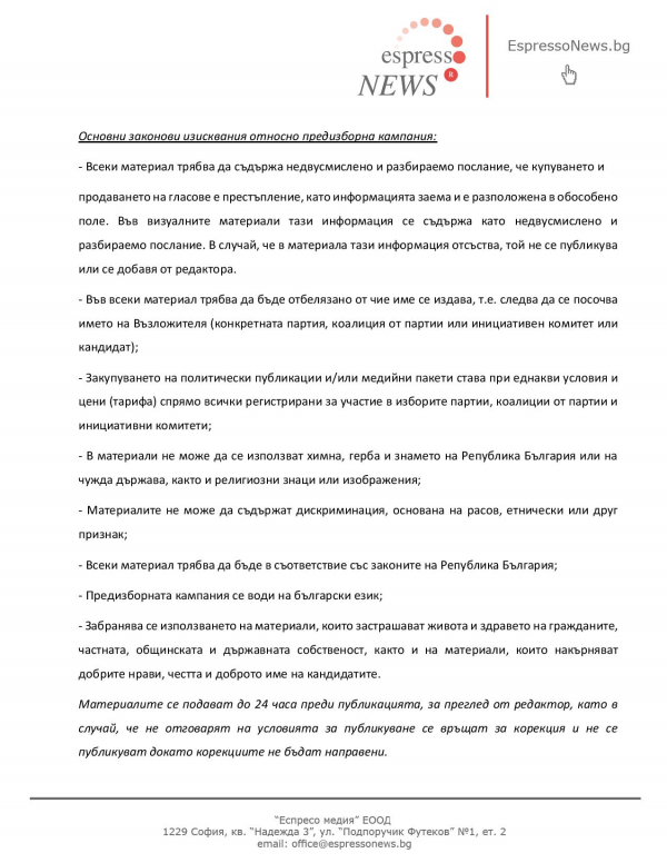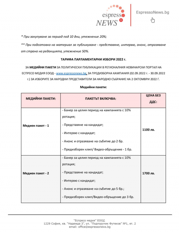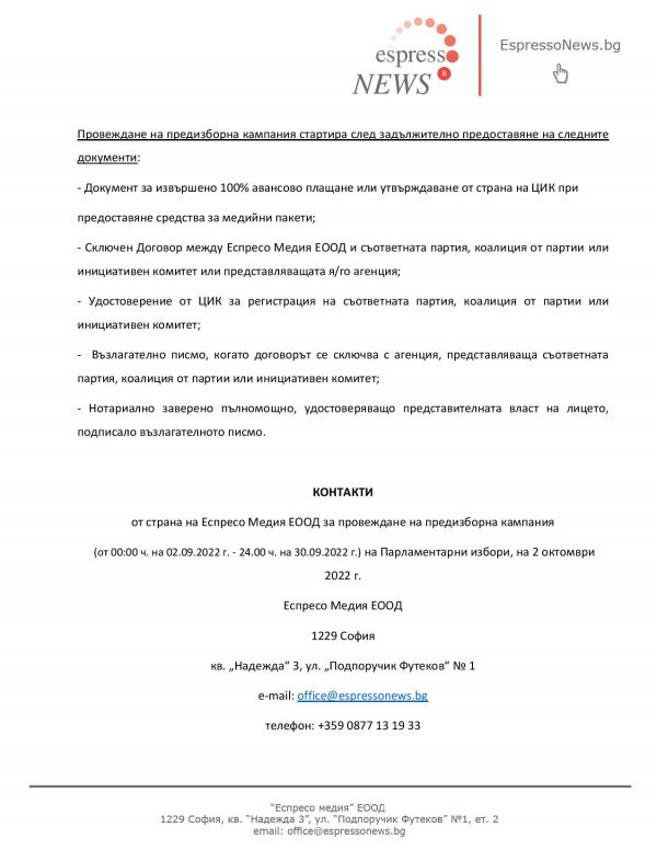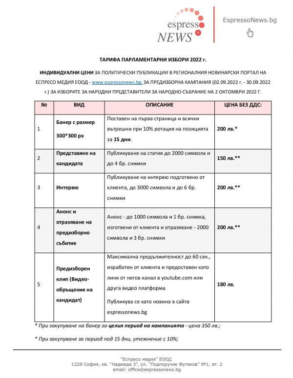 Рекламната тарифа на EspressoNews е валидна за всички партии, коалиции от партии и инициативни комитети, регистрирани за участие в за предстоящите на 2 октомври 2022 г. Парламентарни избори: