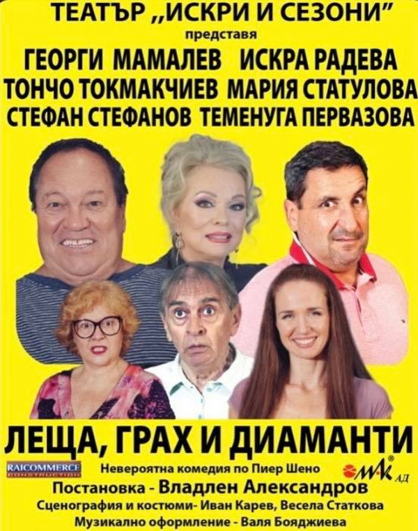 Театър „Искри и сезони“ отново гостува в Костинброд с постановката „Леща, грах и диаманти“. За доброто настроение на публиката ще се погрижат поулярните български актьори Георги Мамалев, Искра Радева, Тончо Токмакчиев, Мария Статулова, Стефан Стефанов и Теменуга Первазова.