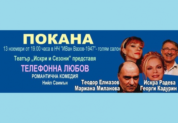 Театър „Искри и сезони“ отново ще гостува в Костинброд. Актьорите Искра Радева, Георги Кадурин, Теодор Елмазов и Марияна Миланова ще представят постановката „Телефонна любов“.
