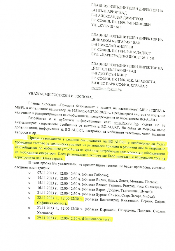 Тестват системата BG-ALERT в Софийска област на 22 ноември /сряда/ в часовото време между 12:00 - 12:30 часа на обяд!