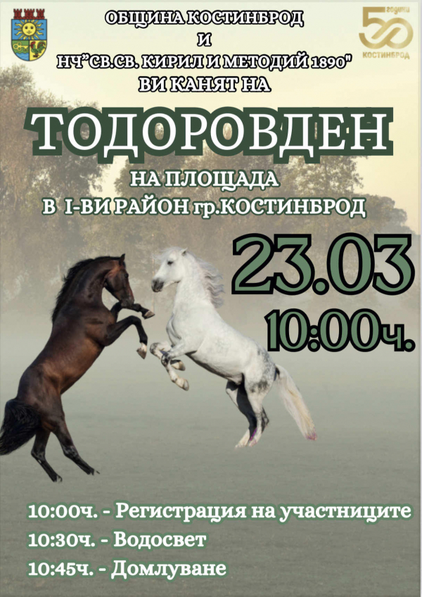 С много настроение и богата програма, в Костинброд ще честватт Тодоровден. Община Костинброд и НЧ „Св. Св. Кирил и Методий 1890” за поредна година организират празненство за своите жители и гости. То ще се проведе на 23 март /събота/, на площада в Първи район, на града.