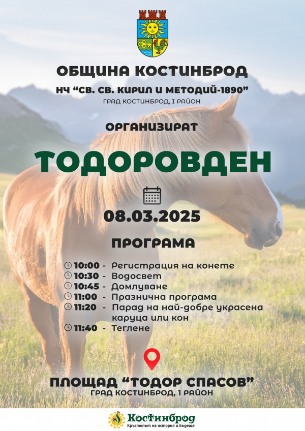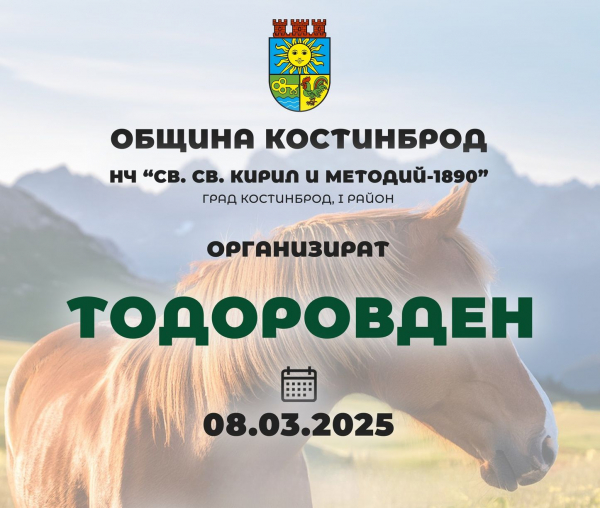Костинброд ще отбележи Тодоровден с богата празнична програма, включваща традиционни ритуали, фолклорни изпълнения и атрактивни конни състезания. Община Костинброд и НЧ „Св. Св. Кирил и Методий 1890” за поредна година организират празненство за своите жители и гости. То ще се проведе на 8 март /събота/, на площад „Тодор Спасов”, в Първи район на града.