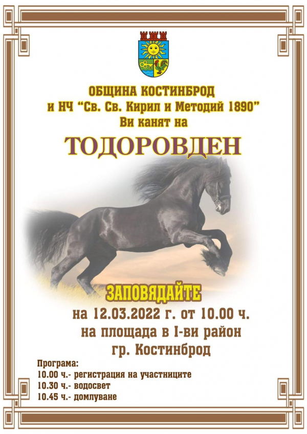Богата програма и много настроение ще изпълнят Костинброд за честването на Тодоровден. По повод Конския Великден, Община Костинброд и НЧ „Св. Св. Кирил и Методий-1890” за поредна година организират празненство за своите жители и гости. То ще се проведе на 12 март, на площада в Първи район на града и е с начален час 10:30 ч.