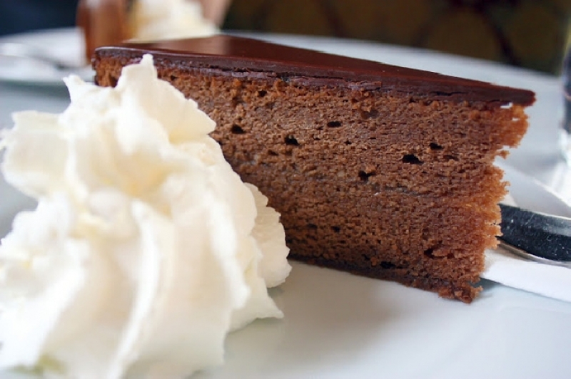 Поднесете парче торта "Сахер" с бита сметана без захар.