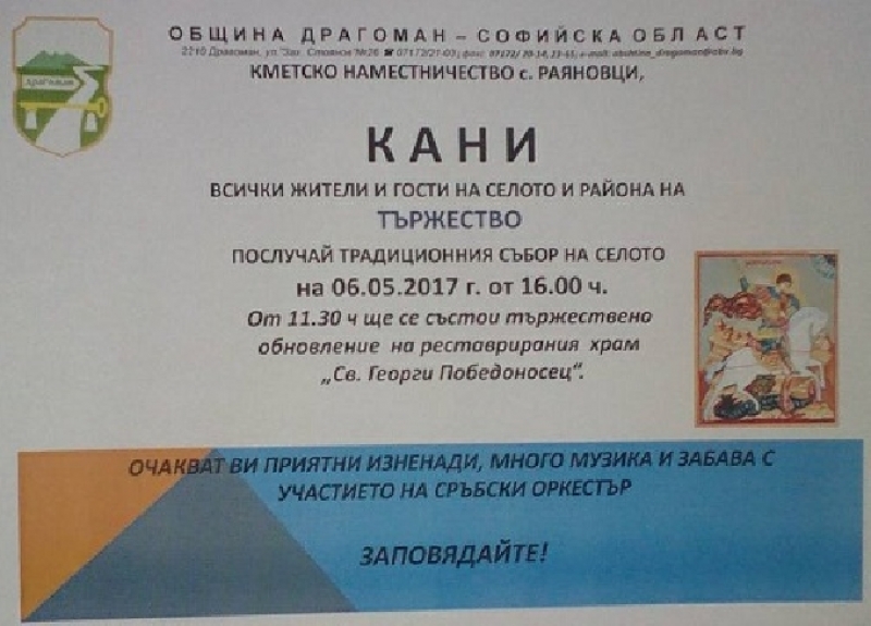 На 06.05.2017 г., в село Раяновци, община Драгоман ще се проведе тържество по случай традиционния събор на селото.