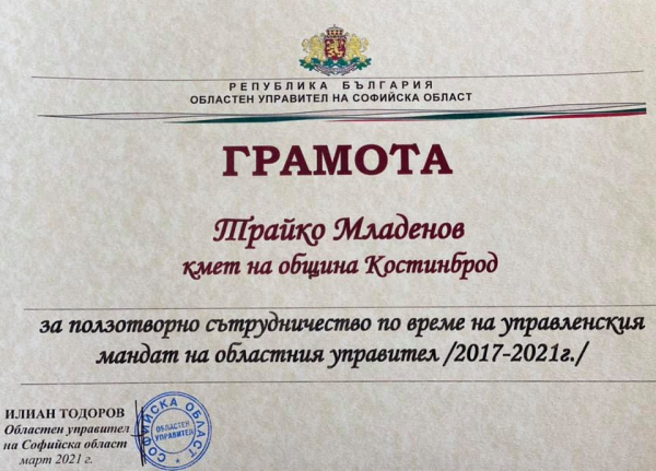 Кметът на община Костинброд г-н Трайко Младенов получи благодарствена грамота от областния управител на Софийска област г-н Илиан Тодоров за добрата работа между двете институции.