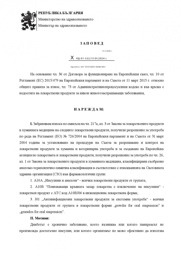 Министърът на здравеопазването д-р Галя Кондева издаде заповед, с която удължава с още месец забраната за износ на определени групи лекарства. Това са инсулини и аналози, и други понижаващи кръвната захар лекарства, както и антибиотици, предназначени за системна употреба в детска възраст.