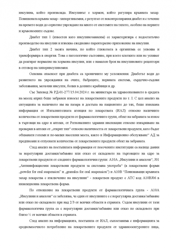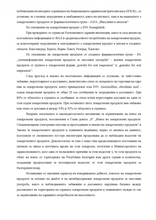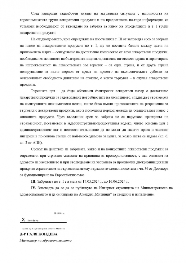 Здравният министър мотивира заповедта си с данни от извършени проверки, които установяват нерегулярни доставки, забавяне или отказ от складовете на търговците на едро за посочените лекарствени продукти. Сегашната забрана за износ на тези групи лекарства изтече на 16 май. Настоящата заповед влиза в сила от 17 май и ще важи до 16 юни 2024 г.