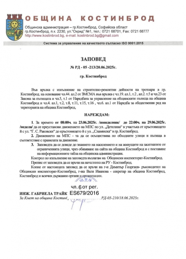 Община Костинброд информира своите жители, че във връзка с изпълнение на строителни работи, за времето от 08:00ч. на 23.06.2025 г. /понеделник/ до 22:00 ч. на 29.06.2025 г. /неделя/ ще бъде преустановено движението на МПС по ул. „Детелина“ в участъка от кръстовището й с ул. „Г. С. Раковски“ до кръстовището й с ул. „Славянска“ в гр. Костинброд.