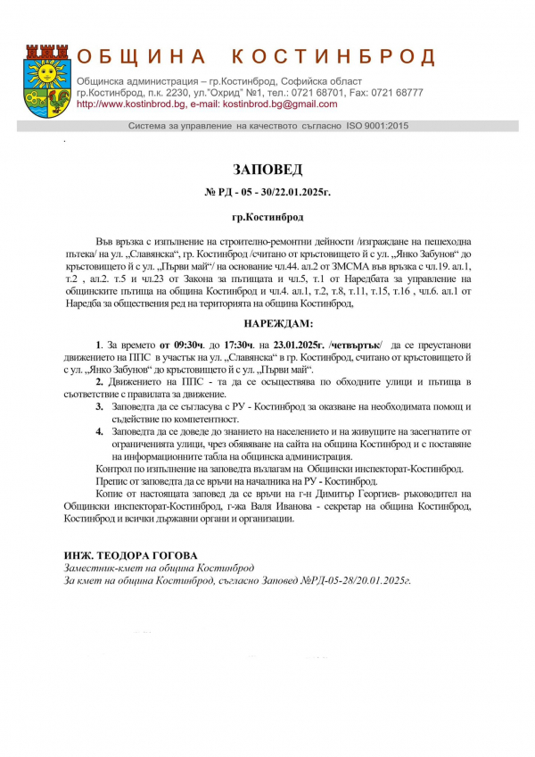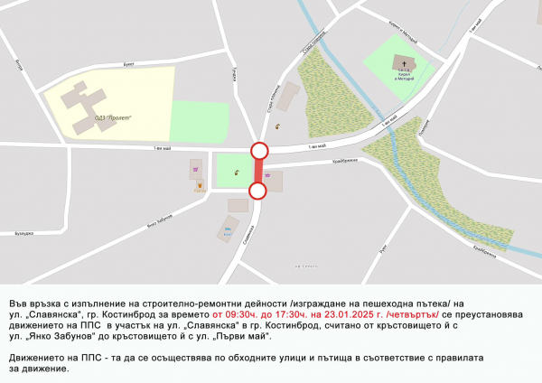 Във връзка с изпълнение на строително-ремонтни дейности /изграждане на пешеходна пътека/ на ул. „Славянска”, гр. Костинброд, за времето от 09:30 ч. до 17:30 ч. на 23.01.2025 г. /четвъртък/ се преустановява движението на ППС в участък на от улицата от кръстовището ѝ с ул. „Янко Забунов“ до кръстовището ѝ с ул. „Първи май“. Движението на ППС-та ще се осъществява по обходните улици и пътища в съответствие с правилата за движение.