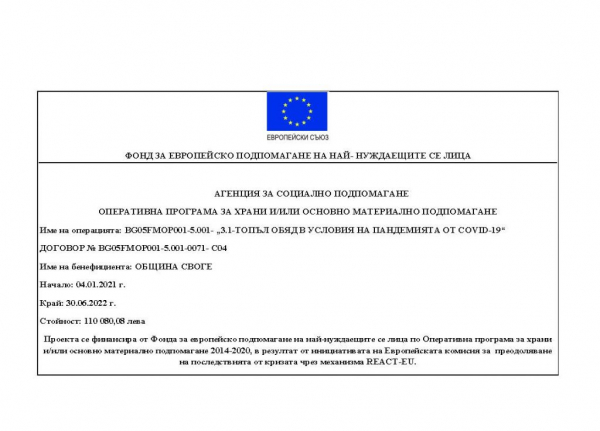 След сключено Допълнително споразумение между Агенция за социално подпомагане, в качеството си на „Управляващ орган“ и Община Своге, в качеството си на „Партньорска организация“, Процедура BG05FMOP001-5.001-0071-C04 - „Топъл обяд в условията на пандемията от COVID-19 в Община Своге“ е с удължен срок на действие до 30.06.2022 г. включително.