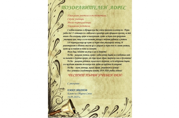 С особено вълнение се обръщам към Вас в този празничен за всички ни - Първи учебен ден! 15 септември не е отбелязан в календара като официален празник, но той винаги е бих вълнуващ, както за малчуганите, които за първи път прекрачват училищния праг, така и за по-големите ученици и техните родители и учители.