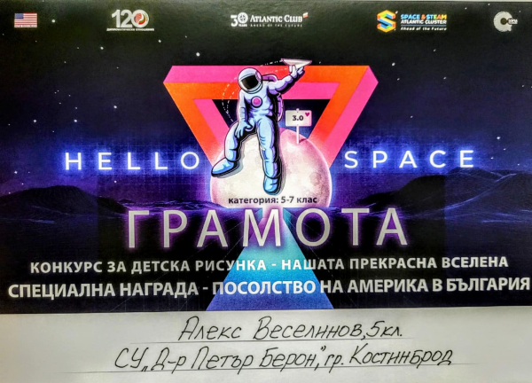 Петколасникът от костинбродското СУ „Д-р Петър Берон“ – Алекс Веселинов, с ръководител Екатерина Трайческа, получи престижната награда от Посолството на Америка в България за своята творба „Към звездите!“.