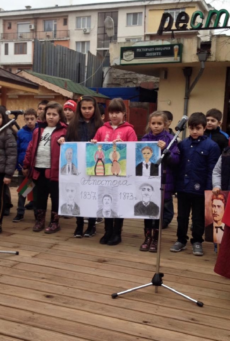 По-късно, в градинката пред базара, децата от 2а, 2б, 2в и 3а клас рецитираха стихотворения, пяха революционни песни и направиха драматизации, свързани с живота на Левски.