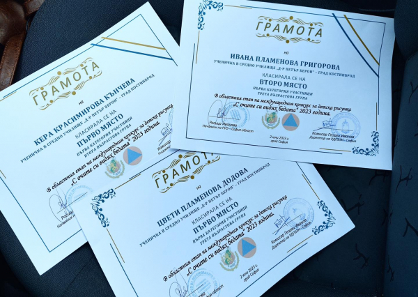 Ученици от Костинброд с призови отличия от областния етап на конкурса за рисунка „С очите си видях бедата“