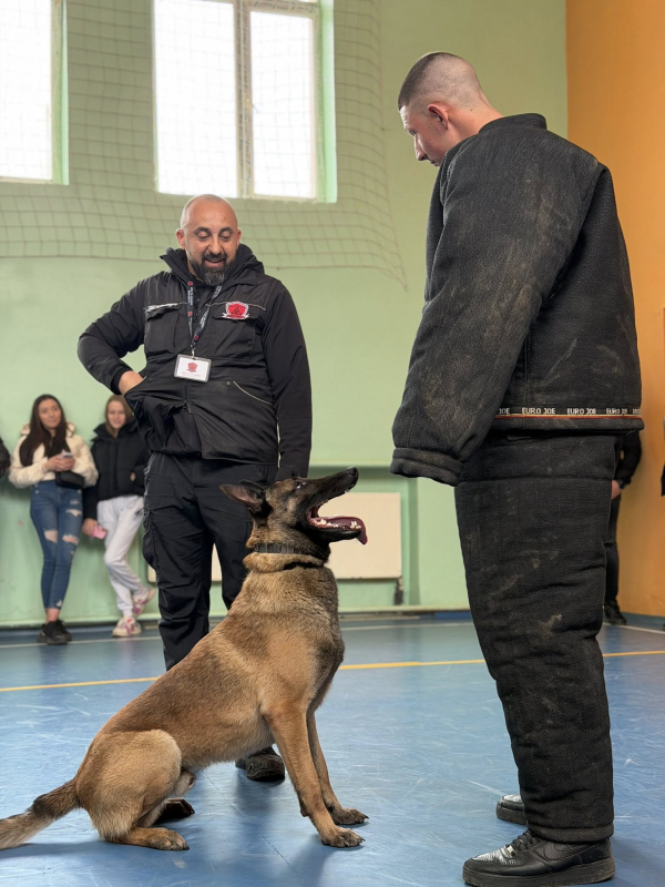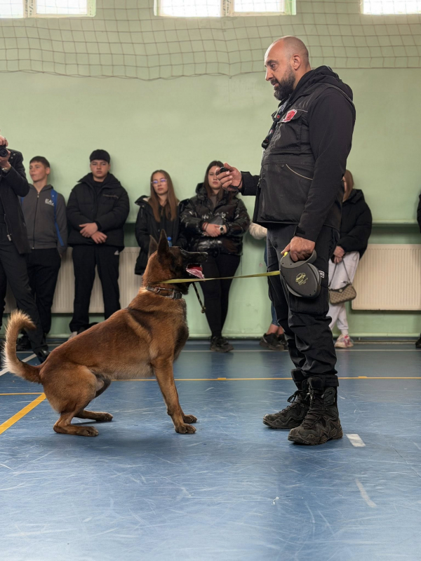 Безспорно най-вълнуващата част за учениците бяха практическите демонстрации, при които Любомир Григоров показа на живо уменията на специално обучени кучета за работа на терен, спецоперации и техните силно развити сетива.