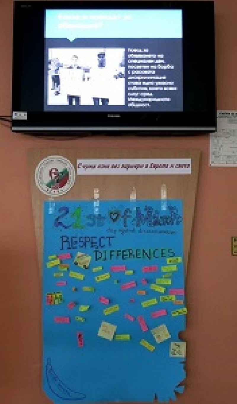 Те отвориха щанд във фоайето на гимназията, на който раздаваха анкети, свързани с расизма и толерантността и изработиха плакати, върху които бяха написани различни пожелания за един по-добър свят. Дванадесетокласници изнесоха открит урок на малчуганите от 6 и 7 клас, като по интересен и завладяващ начин демонстрираха нещастията, които се случват навсякъде по света заради расизма. Бе представено и радиопредаване, разказващо историята на възникването на този специален ден.