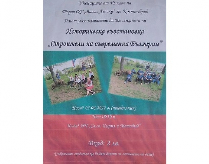 Историческа възстановка „Строители на съвременна България“ ще представят ученици от VI клас на Първо ОУ „Васил Левски“ град Костинброд на 5 юни (понеделник) от 18:30 часа в „НЧ "Св. Св. Кирил и Методий-1890", 1-ви район. Билетите са на цена от 2 лв. Събитието е с благотворителна цел. Събраните средства ще бъдат дарени за лечението на болно дете.